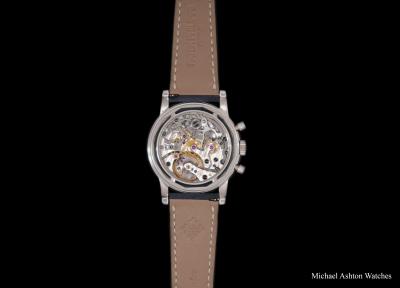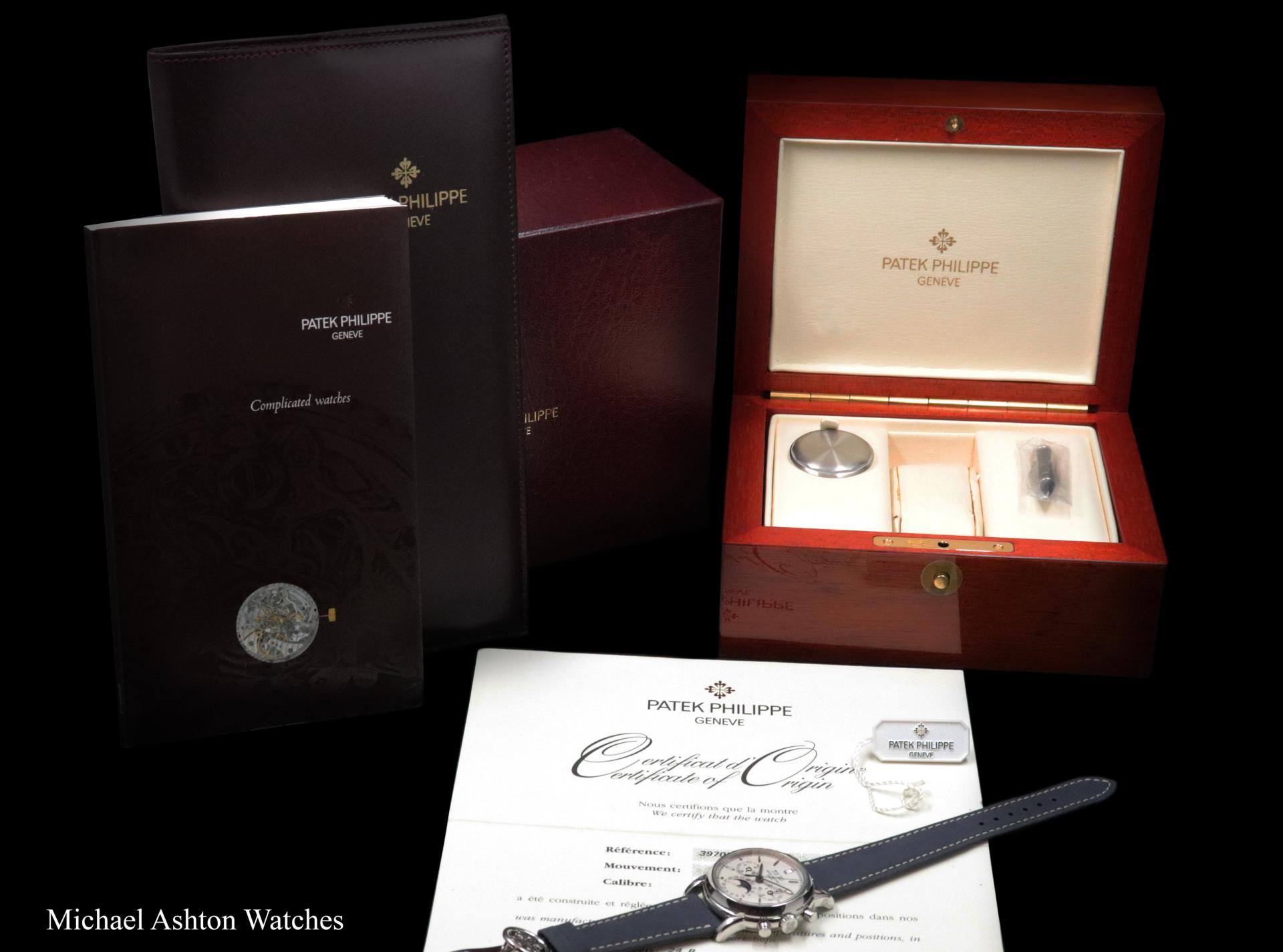 This Iconic Patek Philippe Ref 3970EP-021 Fourth Series Platinum Perpetual Chronograph Is Complete. Accompanied with its certificate of origin, second case back, setting pin, hang tag, instruction manual and presentation box. This 3970EP-021 is in excellent condition with very crisp and legible hallmarks. This late example is from 2004 the final year of production.